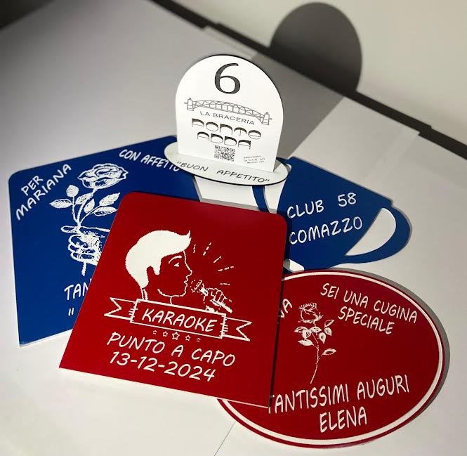 Segna tavoli per ristoranti, Targhe badge, Targhe per numero civico, Segnaletica, Targhe professionali in vari materiali.